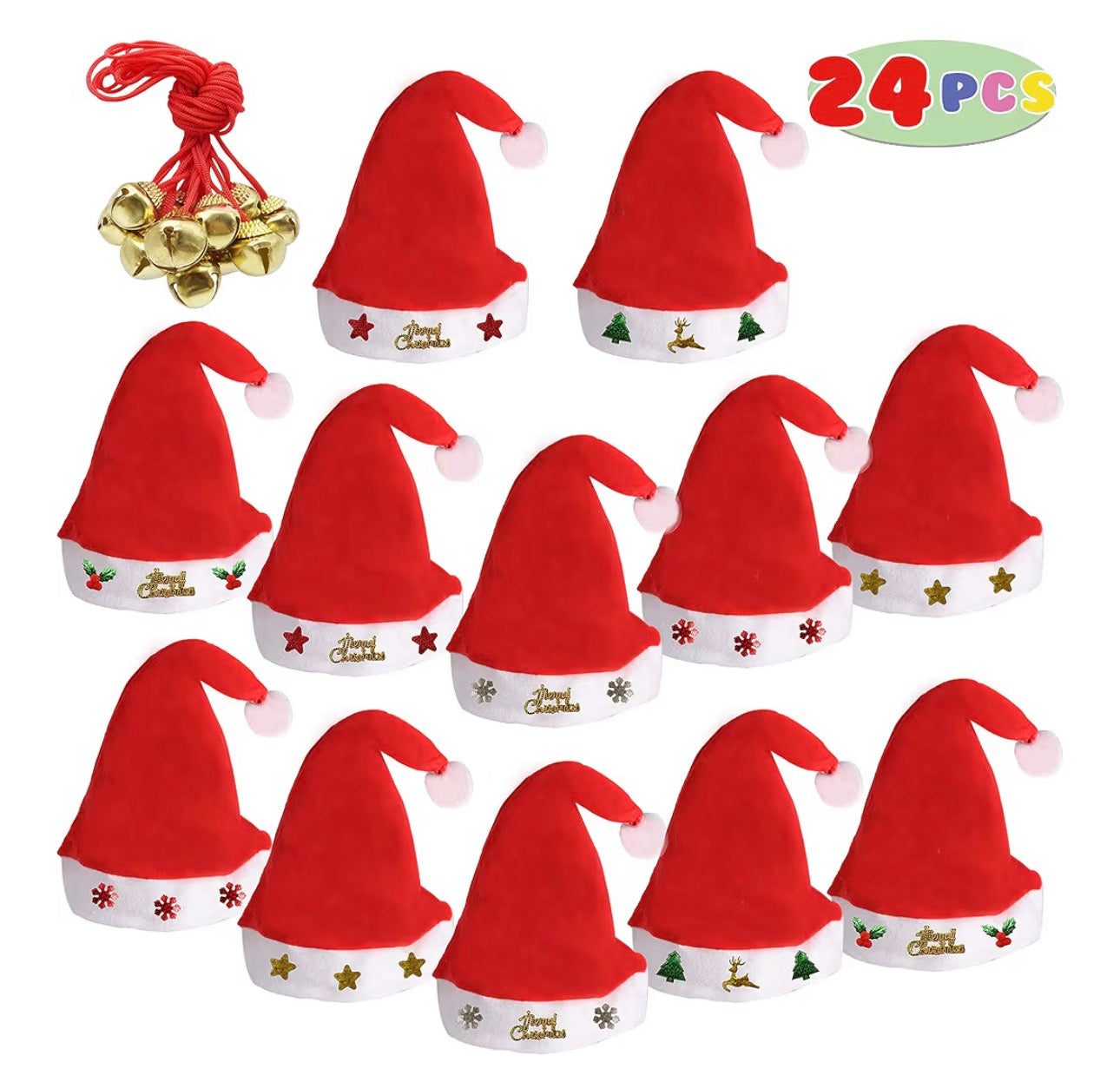 12 Fancy Christmas Santa Hats with 12 Jingle Bell Necklaces Bulk for Christmas Party Favor Photo Booth; One Size Fits All