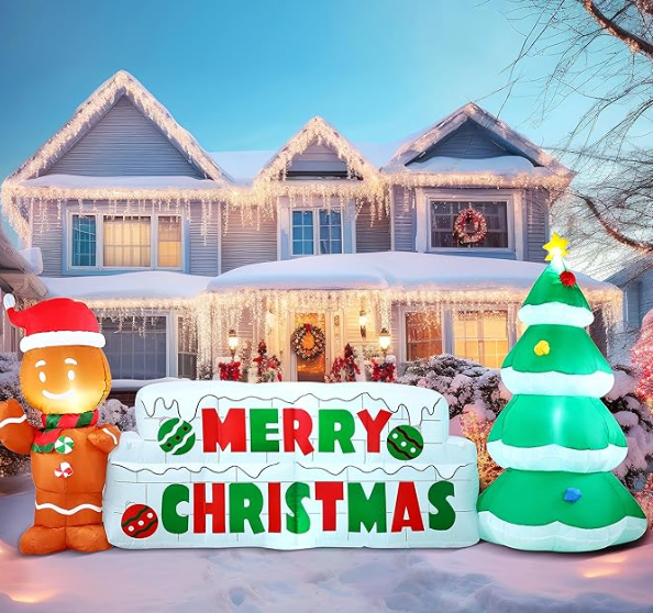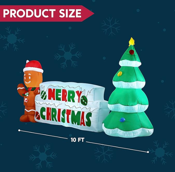 10 FT Merry Christmas Sign Inflatable With Gingerbread Man & Christmas Tree