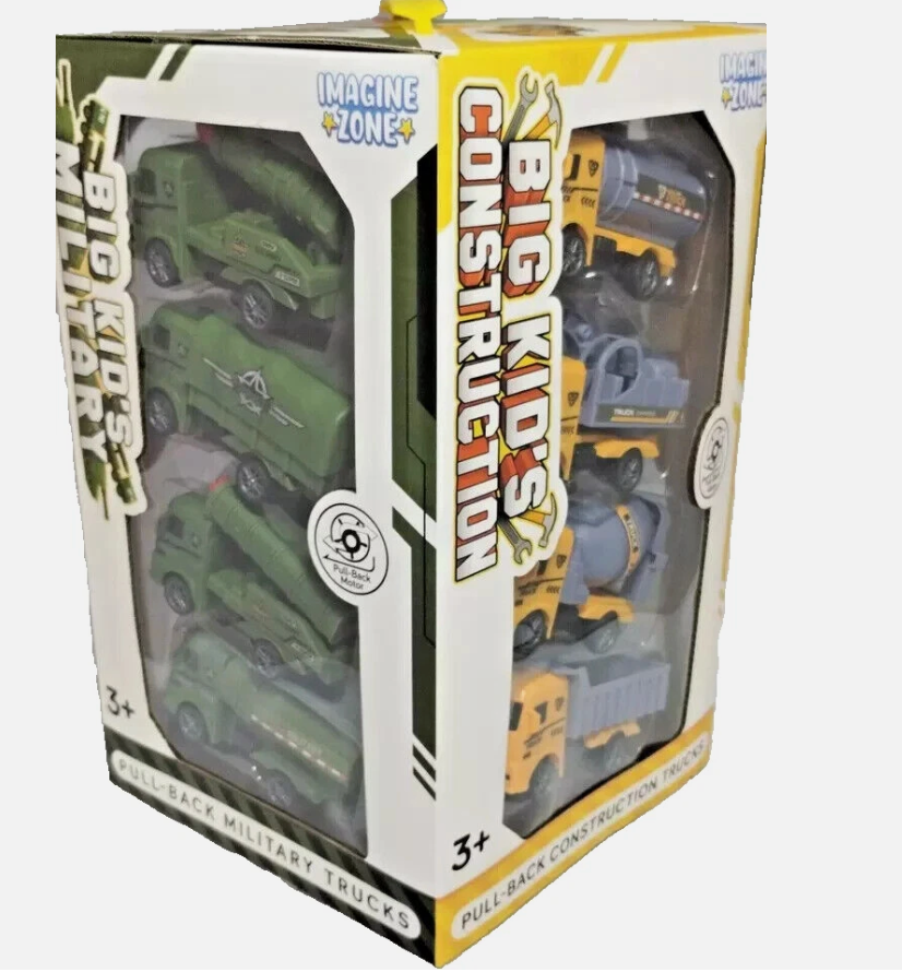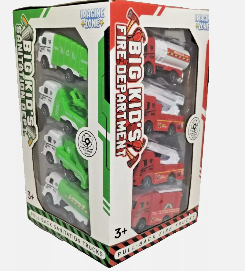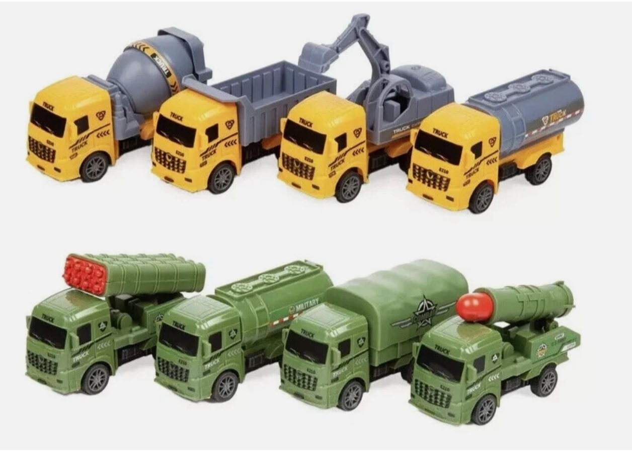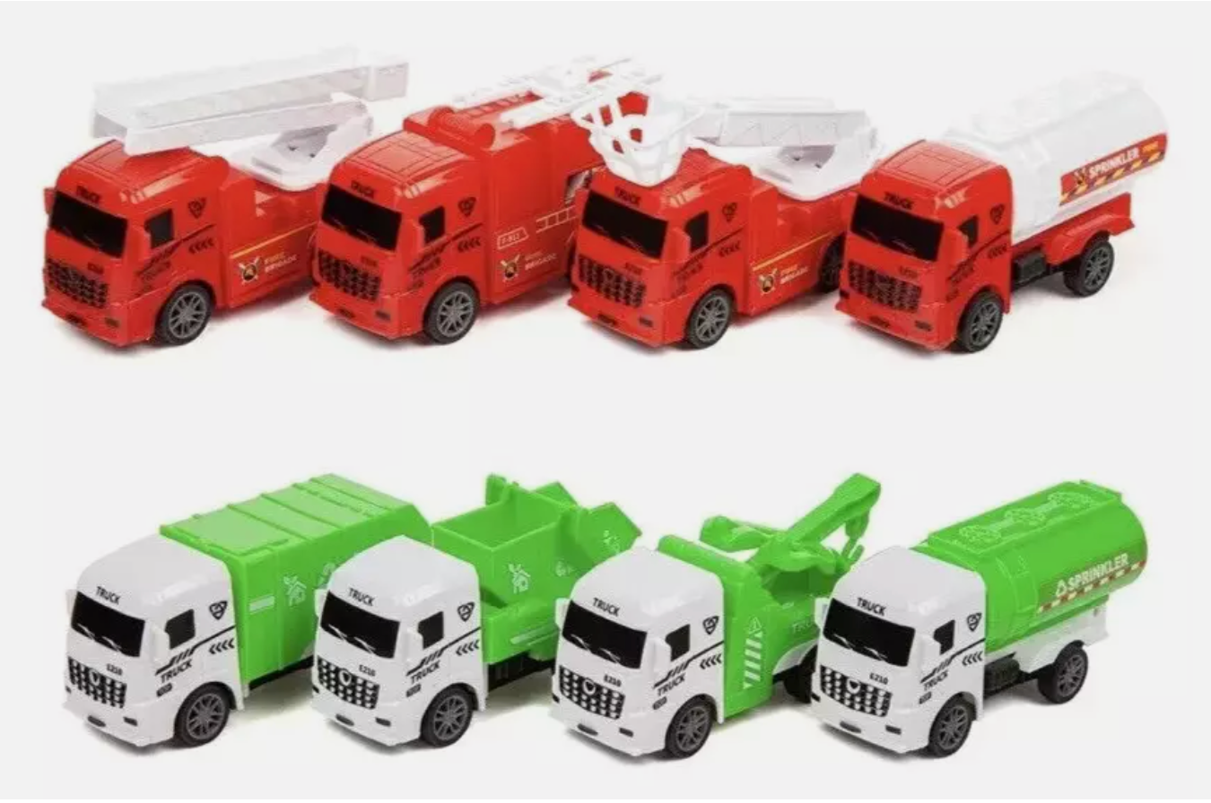 16PCS Pull Back Truck Set - Construction, Fire Engine, Garbage Truck & Military