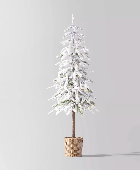 Give your winter wonderland a traditional light-up display with this Pre-lit LED Dewdrop Downswept Flocked Balsam Fir with Basket Artificial Christmas Tree from Wondershop™. This artificial Christmas tree is decorated with downswept pull-down balsam fir branches that are flocked for a natural wintry look. The beautiful tree is pre-lit with LED dewdrop light bulbs to cast a welcoming holiday glow, and it comes inside a woven pot for easy floor display. Add colorful ornaments, tinsel and a shimmering star topper to dress up your tree.