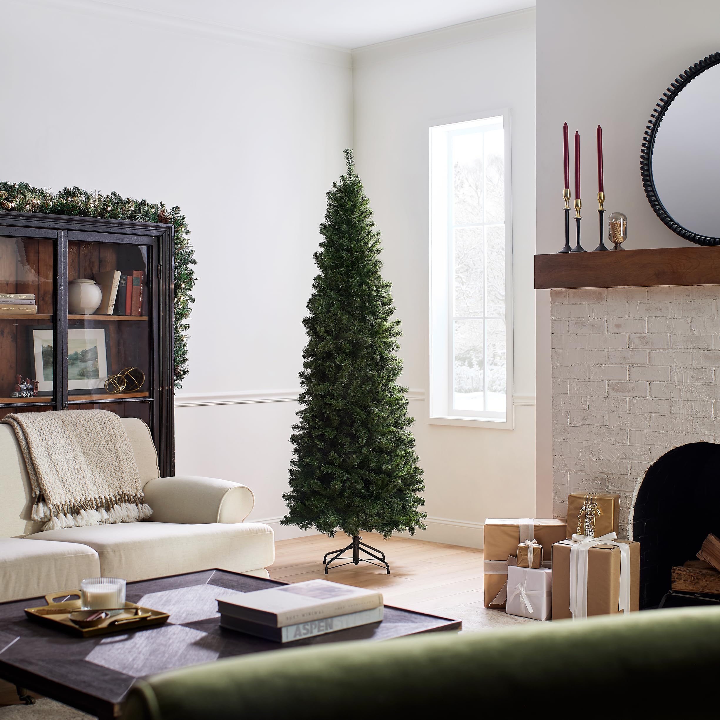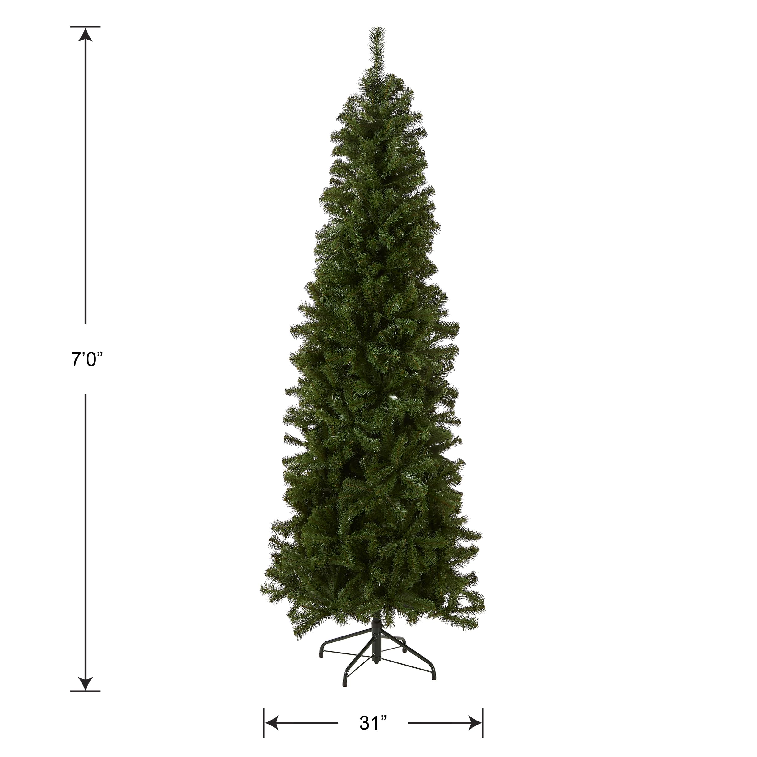 This North Valley Spruce Slim Artificial Green Christmas Tree is 7 feet tall with a 47 inch base diameter. Featuring hundreds of individually crafted branch tips to create full bodied branches, this tree is designed to look and feel lifelike.