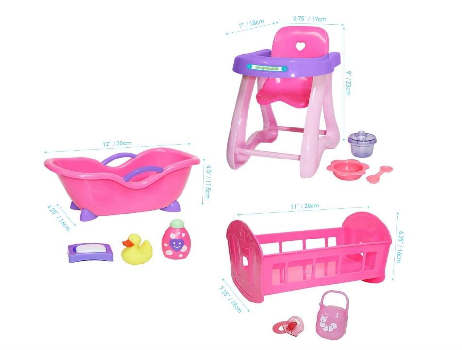 JC Toys Deluxe Doll Accessory Bundle | High Chair, Crib, Bath and Extra Accessories for Dolls up to 11"