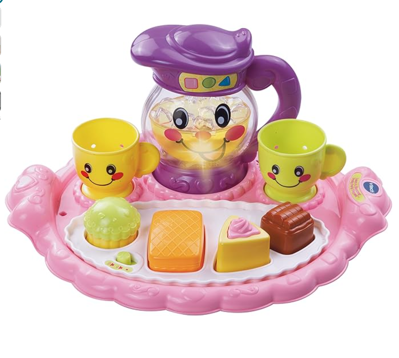 Playset includes a pitcher of pretend lemonade, cups and sweet treats to share with friends 6 sing-along songs are included with the electronic learning toy; As the pitcher is tipped the liquid inside moves to simulate real play.