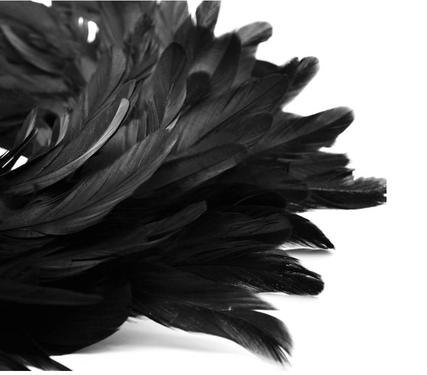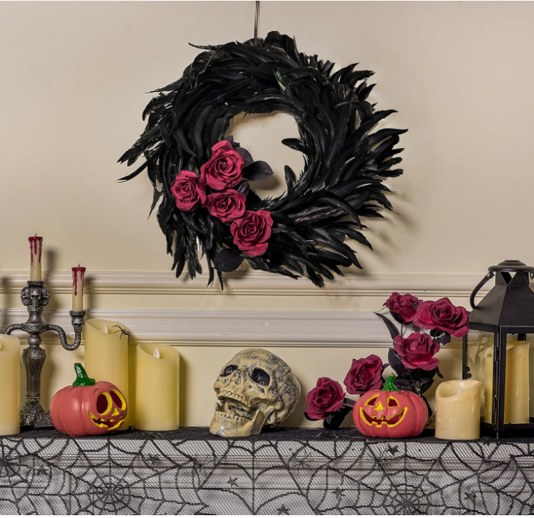 Natural Feathers Wreath 13.5" in Black for Halloween Decorations, Spooky Scene