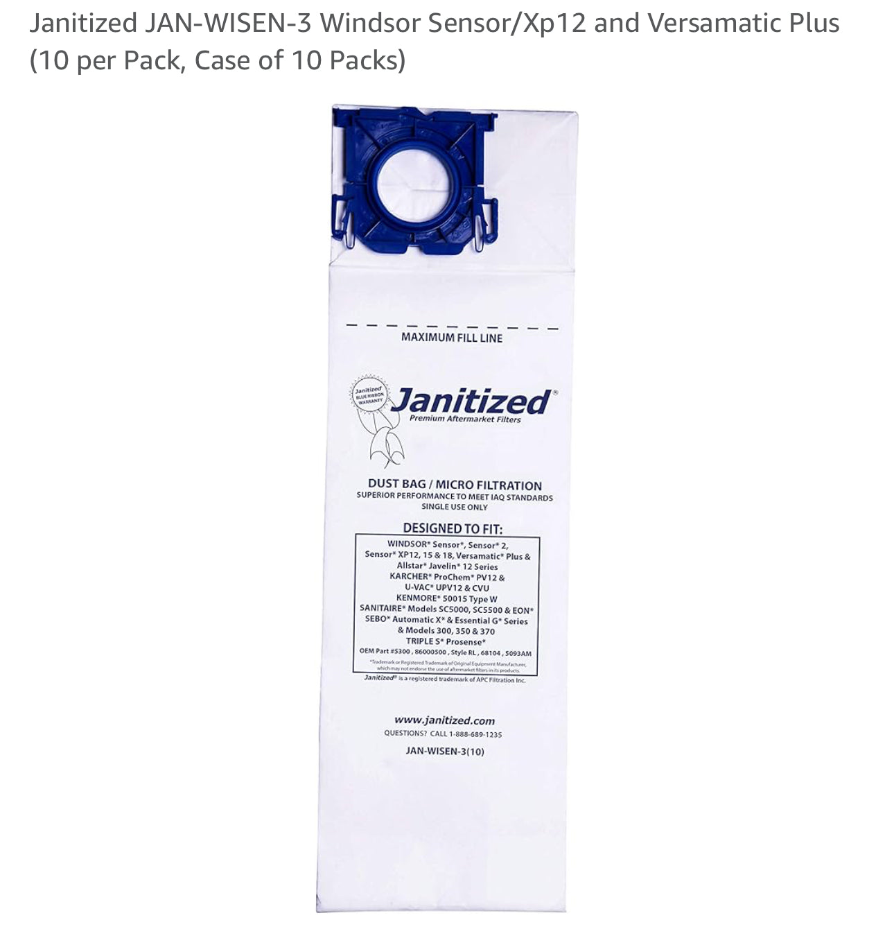 Vaccuum bag - Janitized JAN-WISEN-3 Windsor Sensor/Xp12 and Versamatic Plus (10 count)