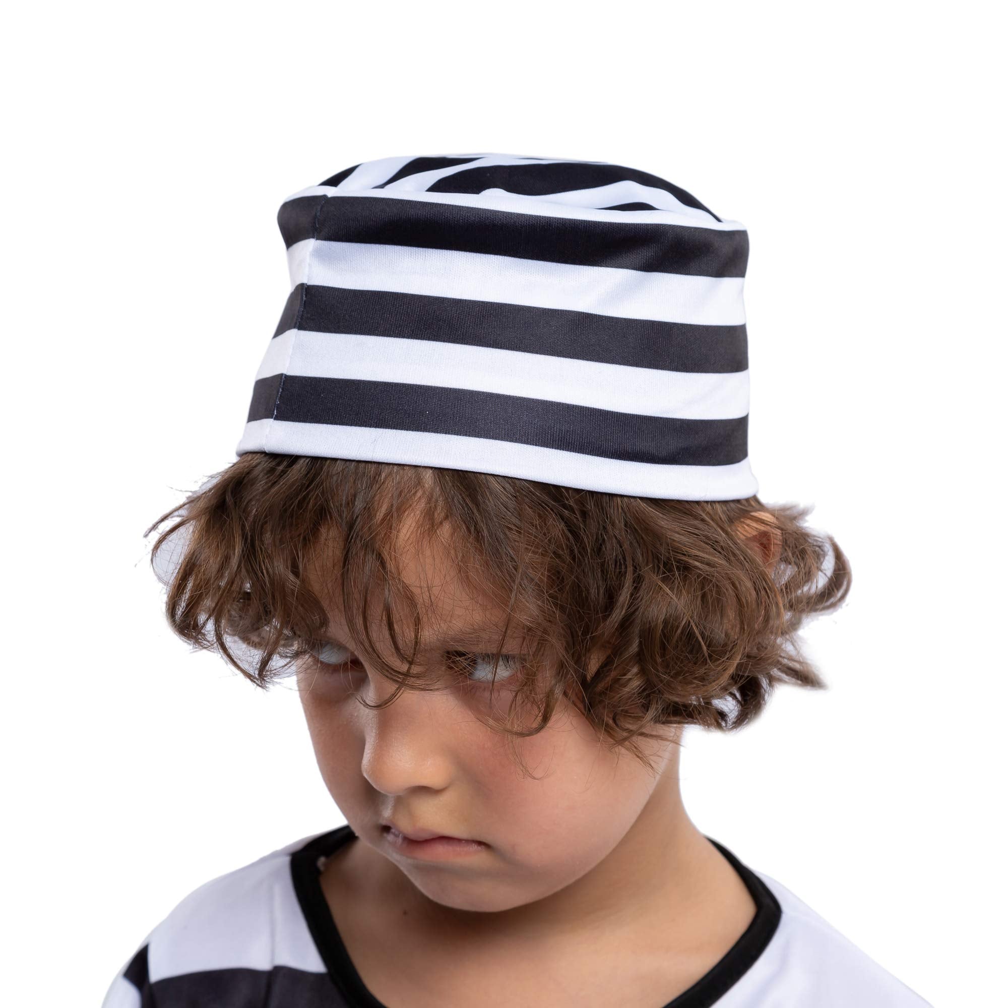 Role-playing Striped Prison Uniform Halloween Convict Costume Includes Jailbird Hat, Balck, and White Striped Shirt with Attached Tattoo Sleeves, Prison Pants and Toy Handcuffs / Ball & Chain for Kids / Baby.