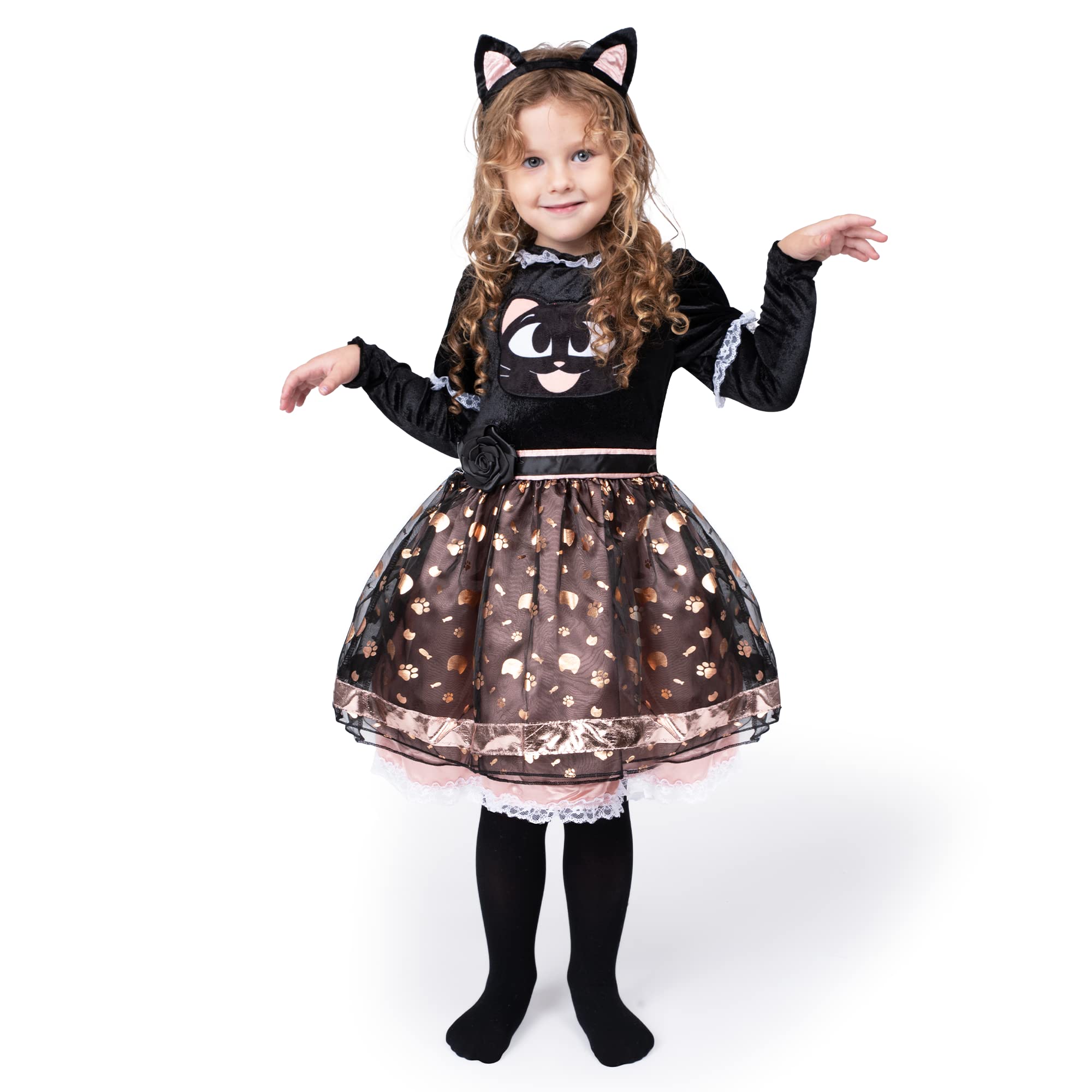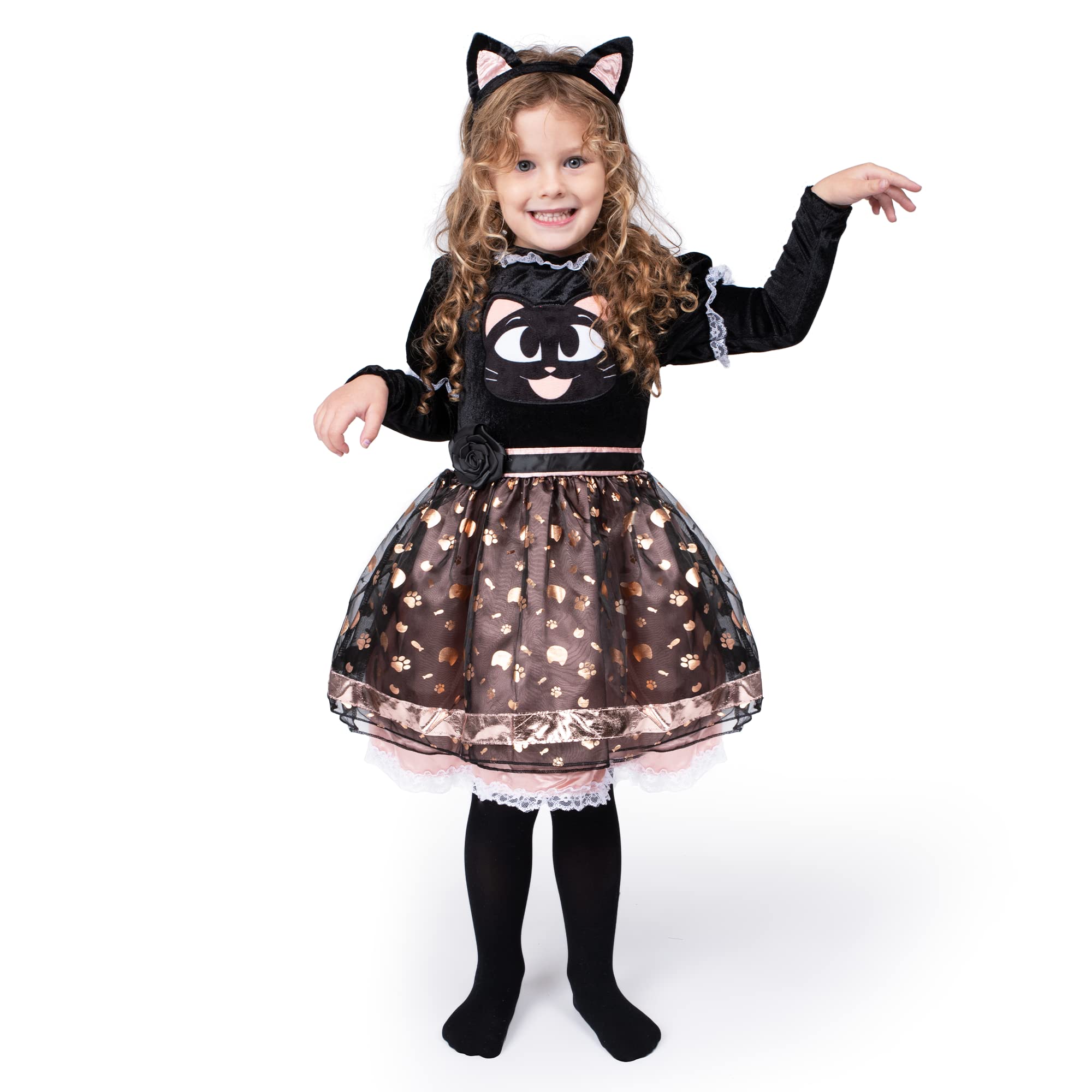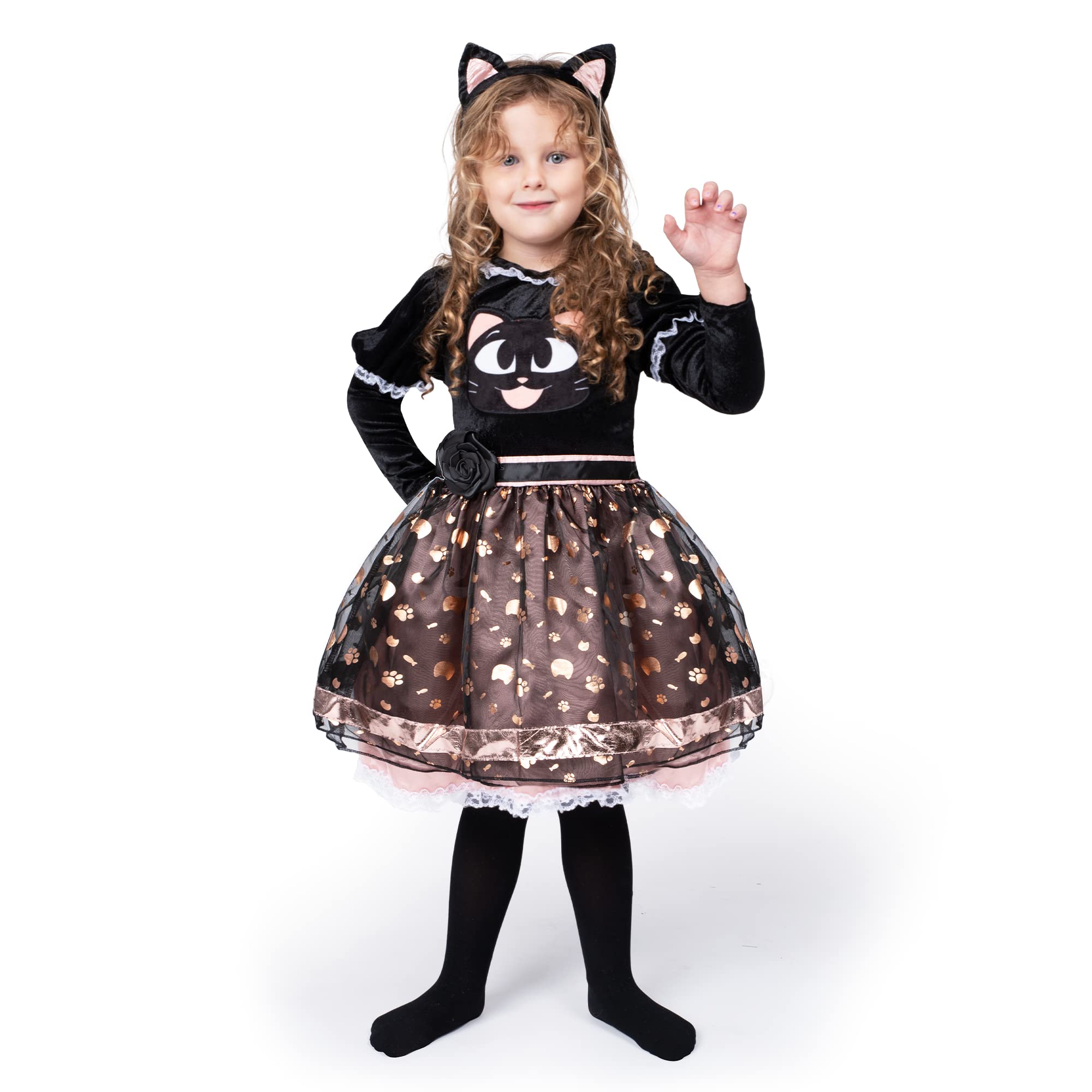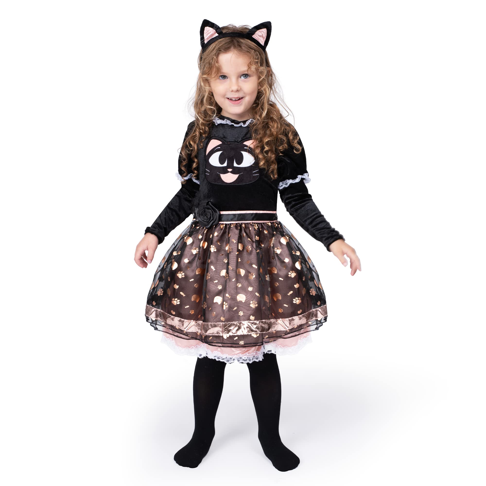 Spooktacular Creation Girl Cutie Cat costume girl Includes a One-Piece Dress with a Tail behind. Multiple layered Skirt printed with golden-foiled kitten patterns. On Halloween night, your child can spread her energy and cheer all around the neighborhood by dressing up in one of these cat dress up costume.