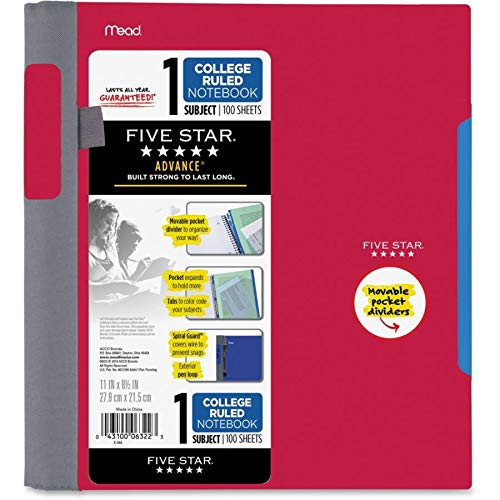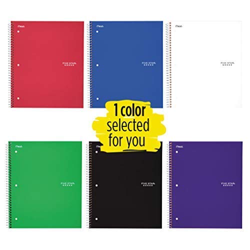 Five Star Spiral Notebook, 5 Subject, Wide Ruled, 200 Sheets, 11 x 8.5 Inch, 1 Notebook, Assorted Colors - Color May Vary (06208) (Pack of 1)