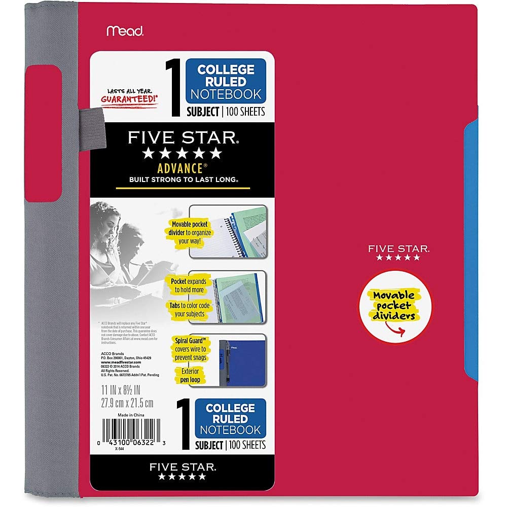 Five Star Advance Spiral Notebook Plus Study App, 1 Subject, College Ruled Paper, 11" x 8-1/2", 100 Sheets, With Spiral Guard and Movable Dividers, Color Selected For You, 1 Count (06322)