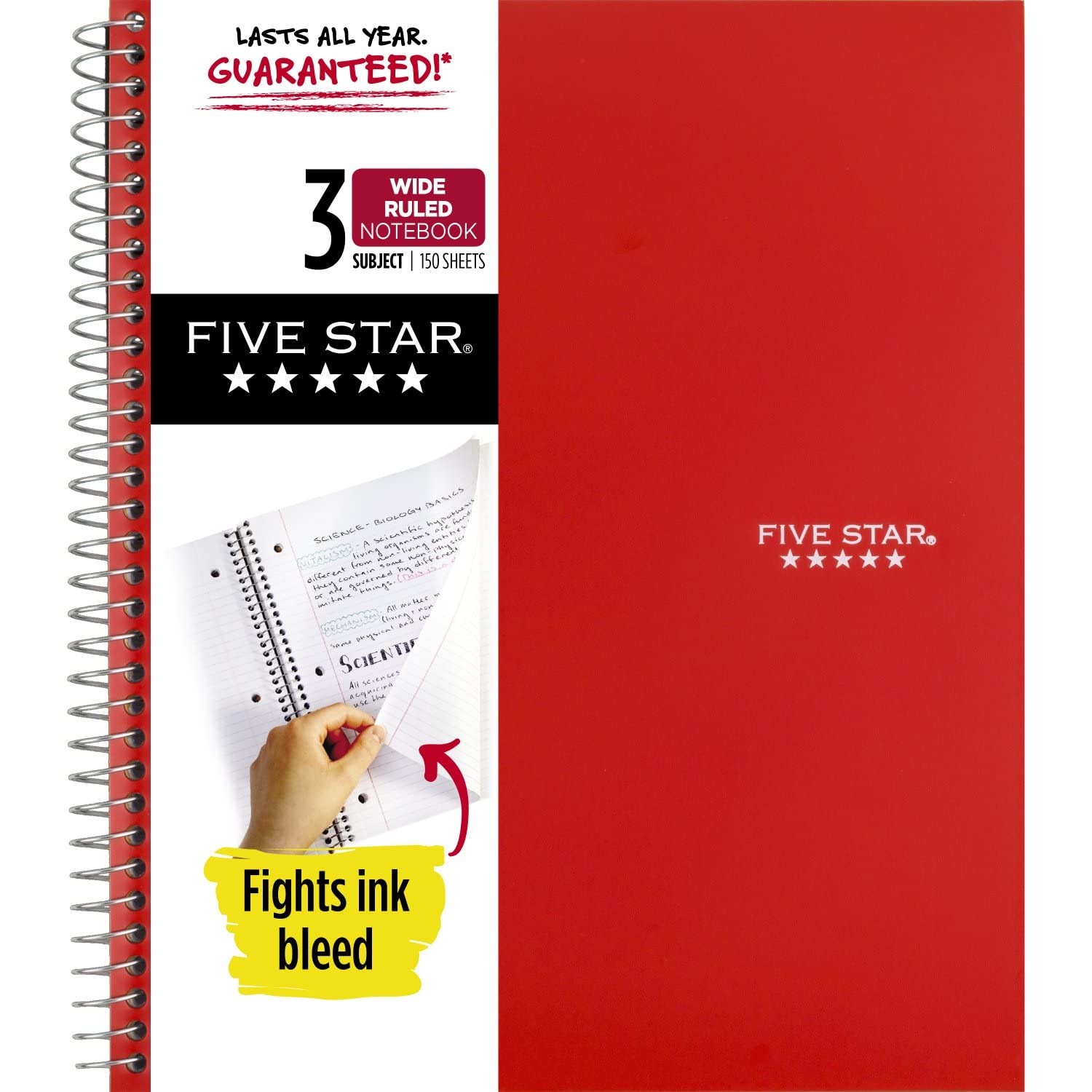 Five Star Spiral Notebook, 3 Subject, Wide Ruled Paper, 10-1/2" x 8", 150 Sheets, Red (72029)
