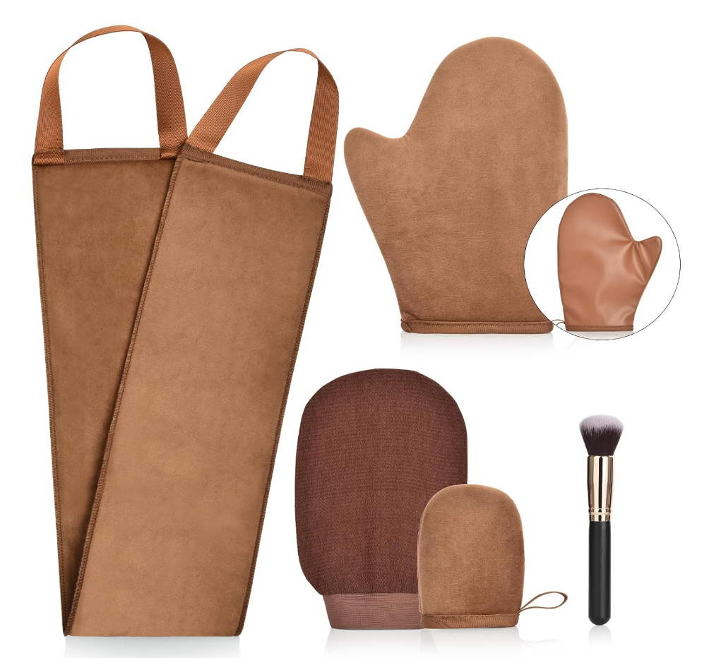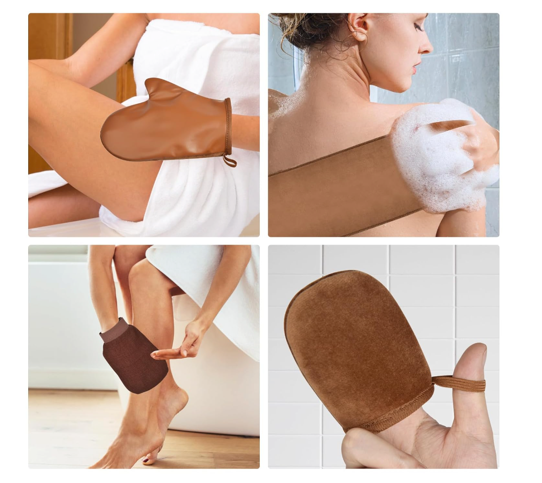 - Ideal combinations: you will receive 1 piece of exfoliating glove, 1 piece of tanning mitt applicator, 1 piece of mini face mitt applicator, 1 piece of back lotion applicator and 1 piece of self tanner brush, sufficient quantity and tools to satisfy your different needs, you can easily finish the work of applying lotion, mousses, and creams by yourself, can be applied not only to apply tanning lotions, sunscreens in summer, but also to apply moisturizing body lotions in winter