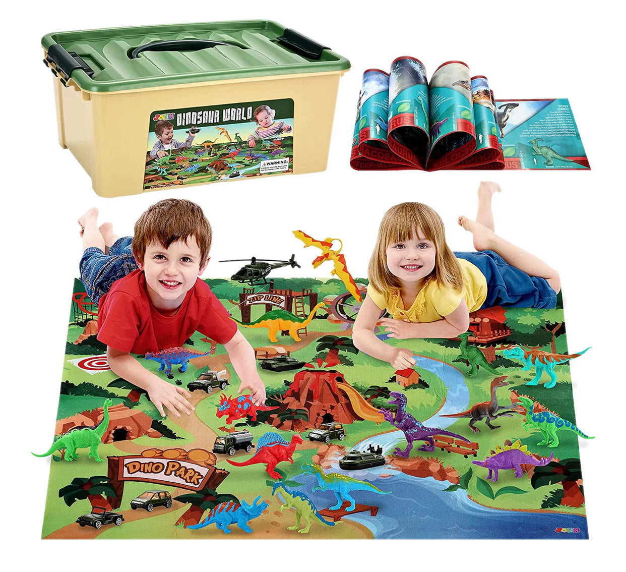 Dinosaur world 24 pcs playset, 15 Dino, 8 military vehicle vehicles, 1 play mat 27”x31”