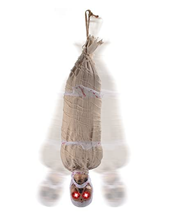 - This Halloween prop appears to be trapped to death in the hanging bag. The bloody bandage warped outside the bag making the corpse look more scary. It's time to scare your friends with our hanging corpse