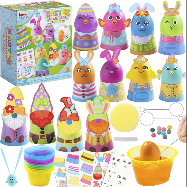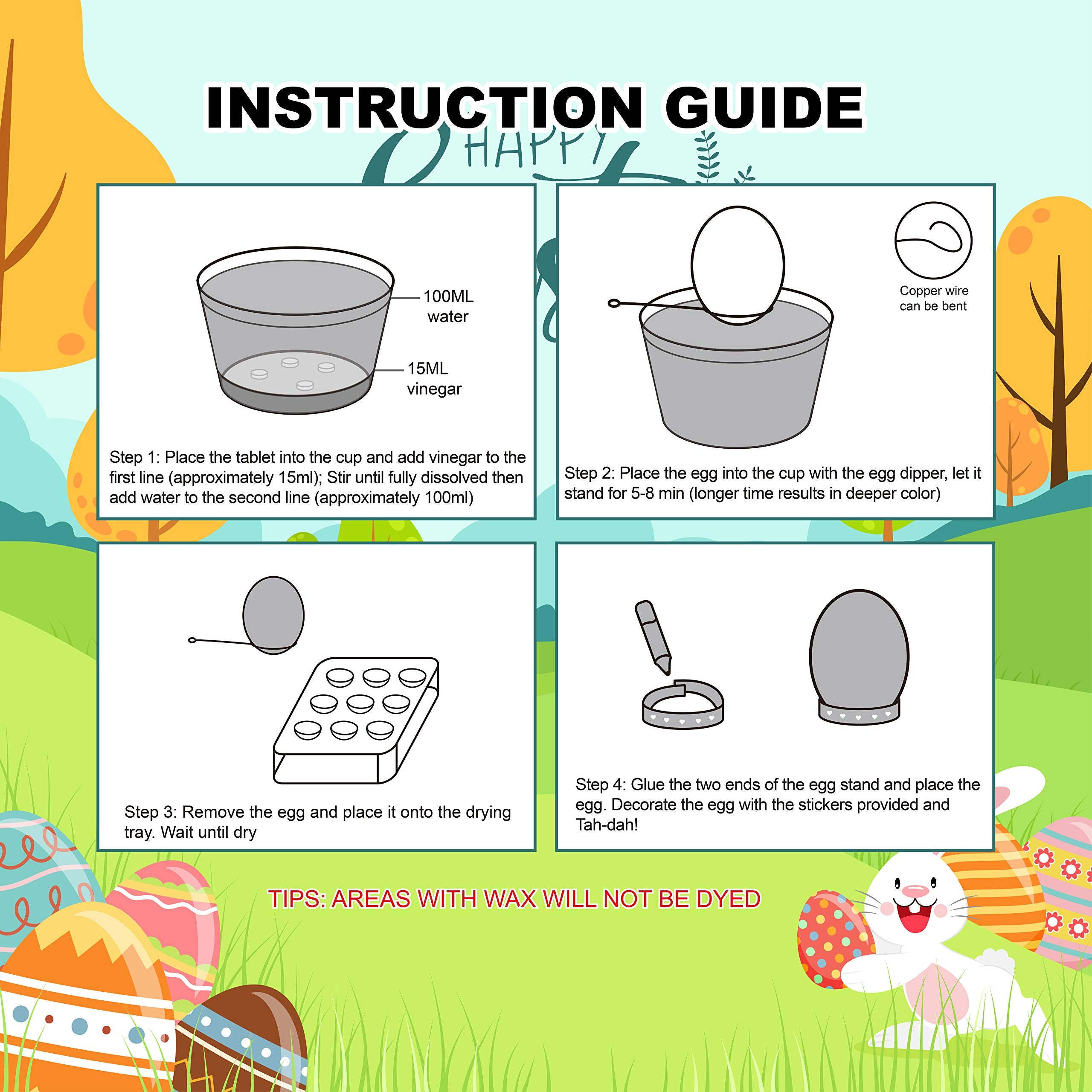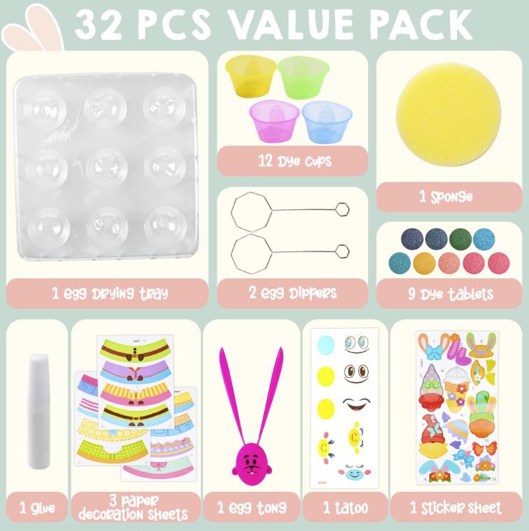 Our Egg Dye Kit includes 9 Dying Cups, 9 Color Tablets, 9 Egg Stands, 2 Egg Dippers, 1 Egg Tray with 9 Precut holes, 1 Rhinestone Sticker, 1 Easter Sticker, 1 Facial feature sticker, 1 3D Sticker and etc