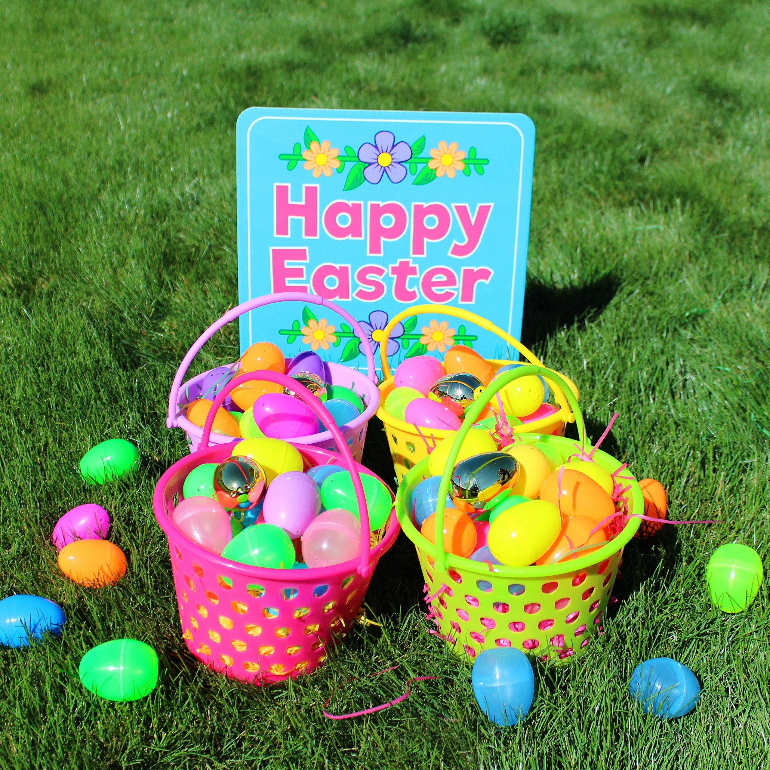 Easter Egg Baskets includes 6 Round Vibrant Pastel Colored Plastic Easter Egg Basket with 2 oz. Classic Easter Basket Grass in Pink, Yellow and Green.