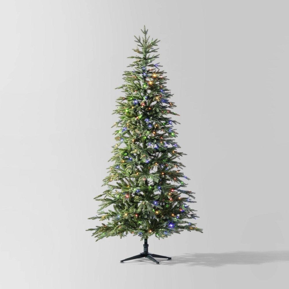 This artificial balsam fir Christmas tree is covered with natural-looking green branches for a traditional look, and it comes illuminated with 400 multicolored and white LED light bulbs to cast a fun and festive glow. The decorative tree designed with hinged branches is easy to set up and store, and it includes a metal base for instant display on the ground. Simply pair with your favorite ornaments, garlands and other embellishments to create a whimsical holiday look.