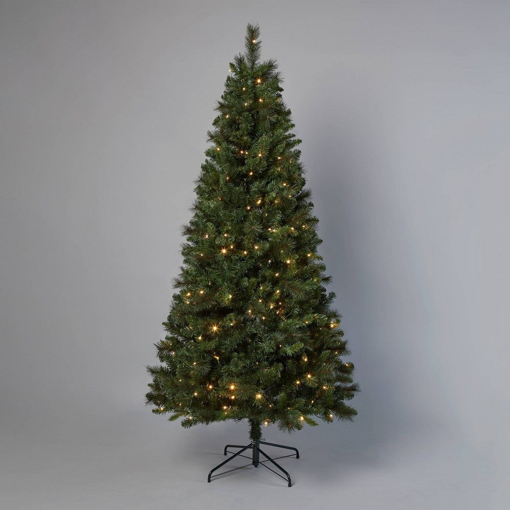 This seven-foot-tall faux Douglas fir Christmas tree lends a realistic, natural look to your seasonal decor. It comes pre-lit with 300 multicolored LED bulbs with a color-changing effect for fun movement and playful flair. The artificial tree offers convenient, maintenance-free construction, and it includes a metal base for easy and stable placement on the ground.