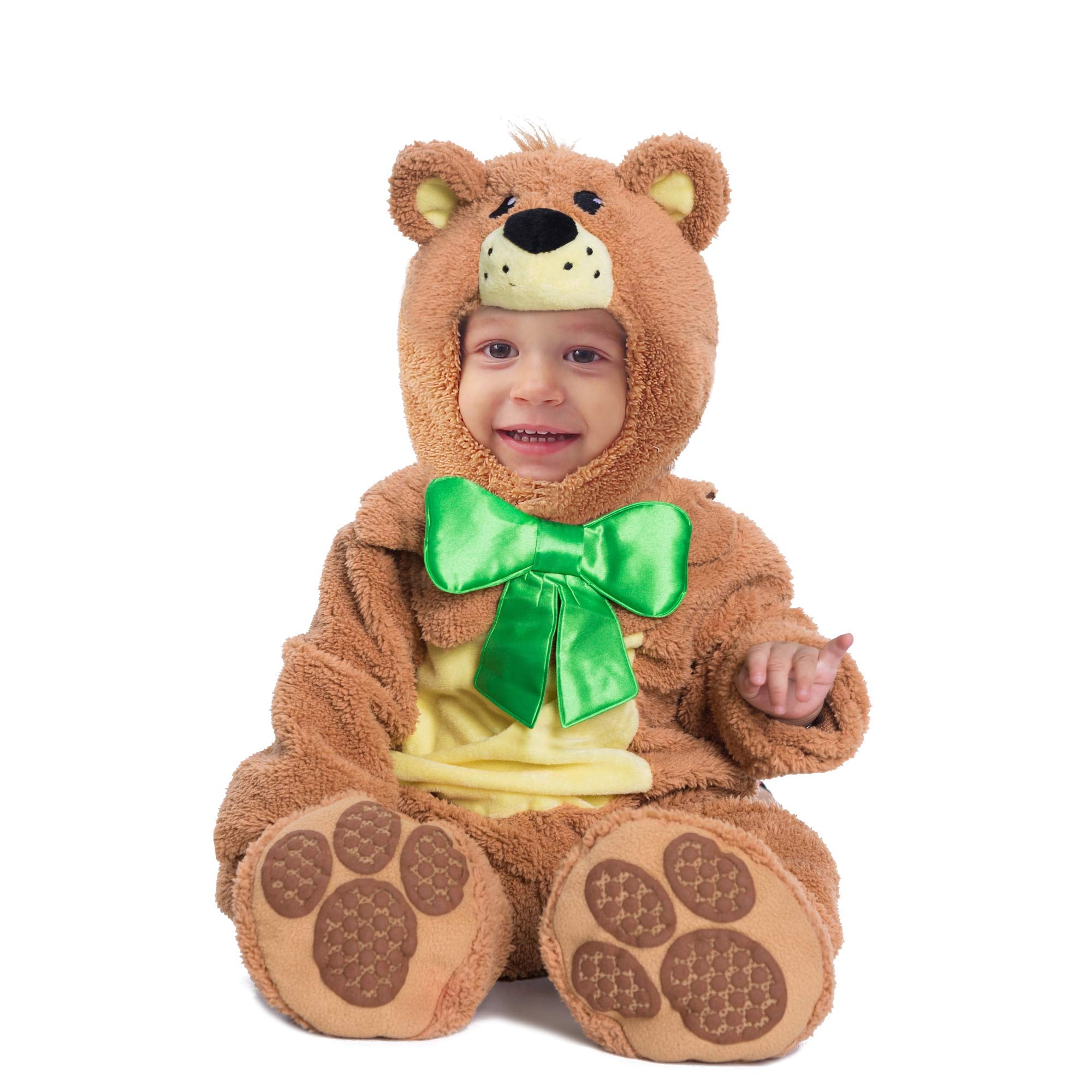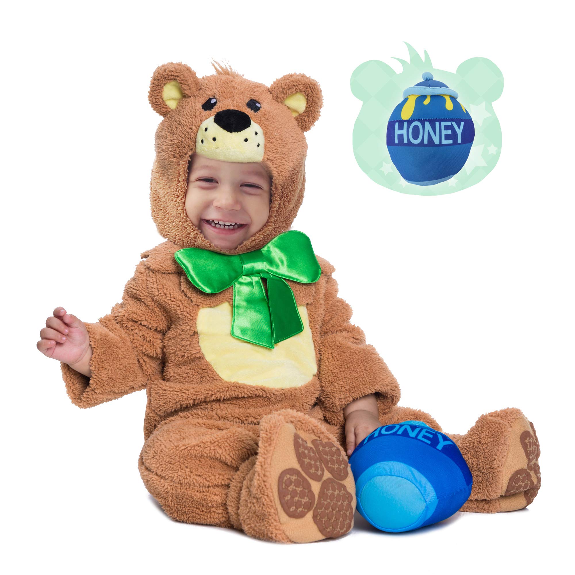 This teddy bear Costume Deluxe Set by Spooktacular Creations. Includes Bear Jumpsuit, Bear Booties, Bear Hood, and Honey Pot Plush Accessory for your Baby to Carry!