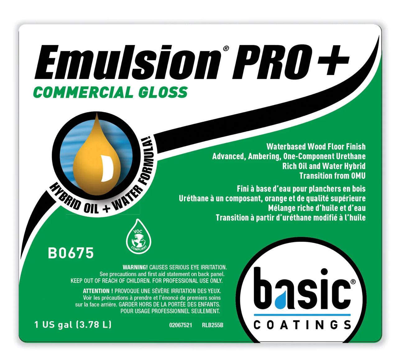 Emulsion® PRO+ is a one-component, commercial grade, self-leveling sealer and finish. This product contains an oxidative, crosslinking polyurethane (OCP). Ideal for use in residential, commercial, or sport wood flooring applications. Ambering quality, enhances the beauty of wood. This product also contains contains a low amount of volatile solvents, which allows it to be Low-VOC. The low-odor formulation is also non-flammable.