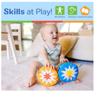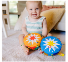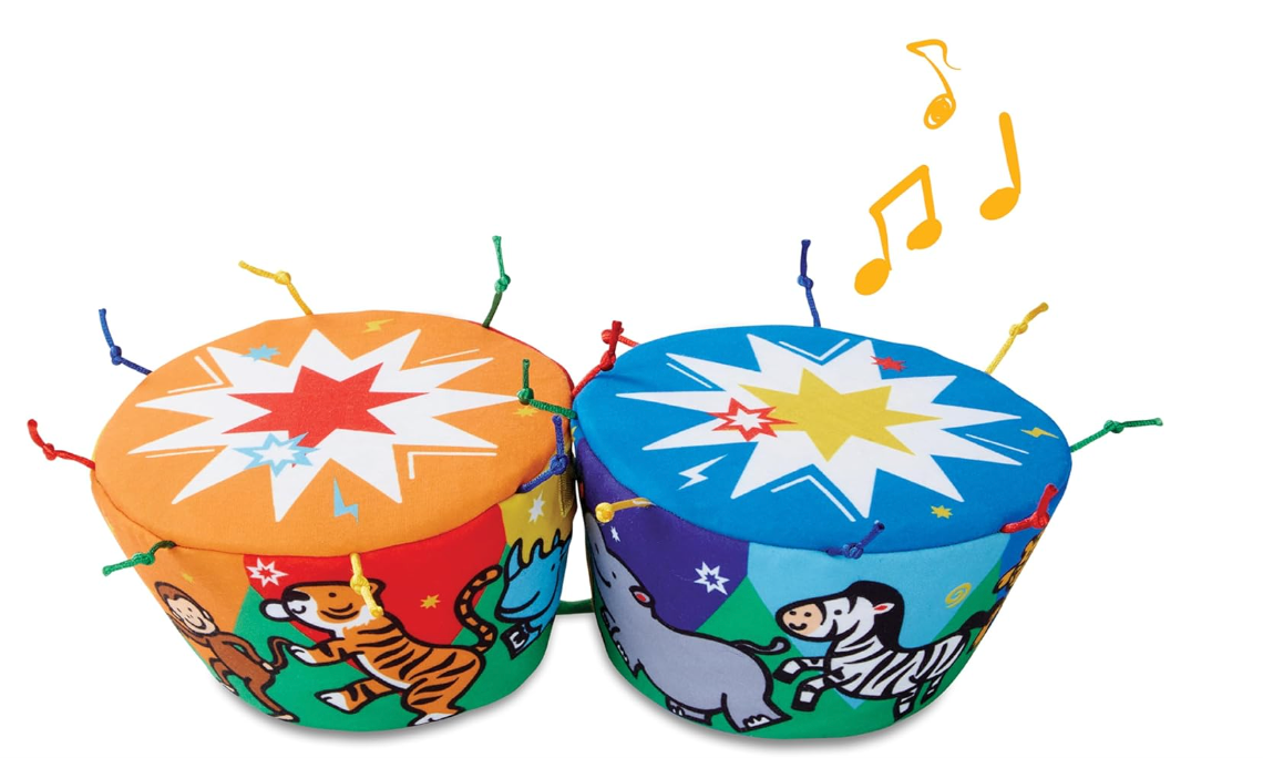 Soft, cloth-covered bongo drums with three different “play modes”- Music mode plays a song and kids can add drum sounds; drum mode plays drum sounds when bongos are tapped; turn off for quiet play