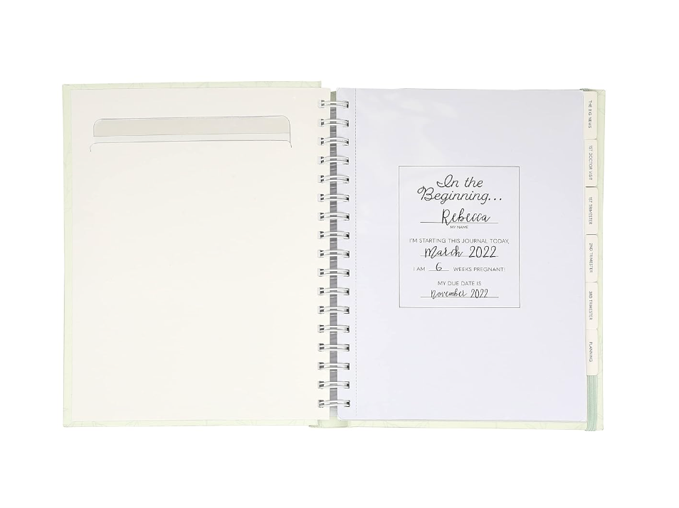 - Spiral bound journal includes elastic strap and 68 pages with 7 tabbed sections: the big news, 1st doctor visit, 1st trimester, 2nd trimester, 3rd trimester, planning and the big arrival