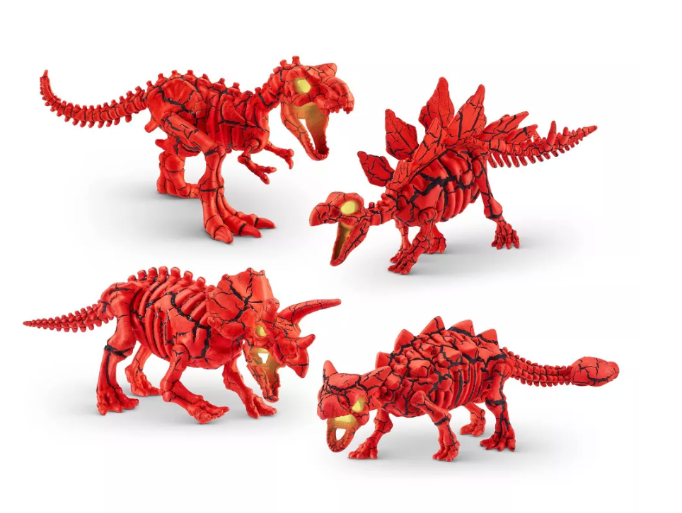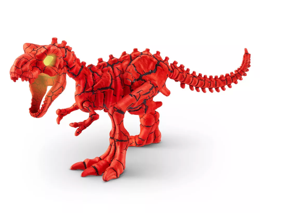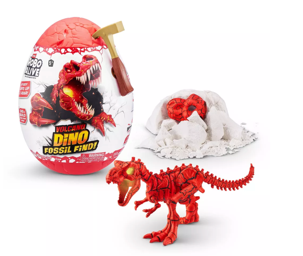 Turn up the heat with Robo Alive Volcano Dino Fossil Find. Dig through volcanic rock, sand, and slime using the excavation tool to find 1 of 4 magma dinosaur fossils. Have you discovered the fearsome T-Rex, terrifying Triceratops, awesome Ankylosaurus or the striking Stegosaurus? Assemble the fossil pieces to bring your dinosaur skeleton to life with lights and sounds! With a light up magma look and realistic dinosaur roar, these Dino fossils are like nothing you've seen before. It's more than alive - It's Robo Alive.