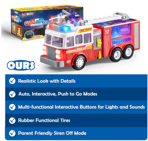 - An Ideal Gift & Learning Tool: The GlowRover LED Fire Truck is a top toy fire trucks for boys and an educational electric fire truck kids toy. Perfect for any occasion, it blends fun and learning, enhancing motor skills, hand-eye coordination, and cause-effect understanding in fire trucks for toddlers.