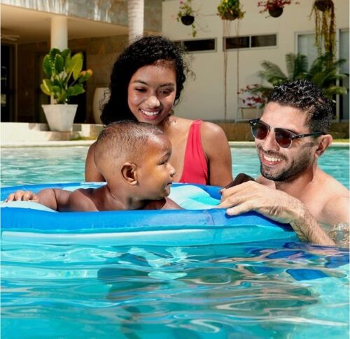 The inflatable toddler pool float has fabric covered inflation for added durability, a soft mesh seat with cutouts for the arms to begin developing those all-important paddling movements.