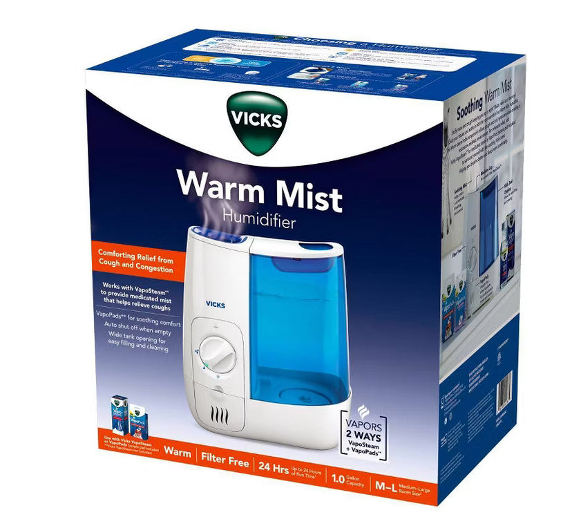 Relax in an oasis of peaceful warmth and moisture with the Warm Moisture Humidifier in White/Blue. This mist helps temporarily relieve cold and cough symptoms while creating a cozy, comforting environment. For enhanced relief, add Vicks VapoSteam or VapoPads to surround yourself with the soothing Vicks scent. The Vicks Warm Mist Humidifier comes with a medicine cup for use with inhalants. Now, you can breathe with ease and sleep comfortably.