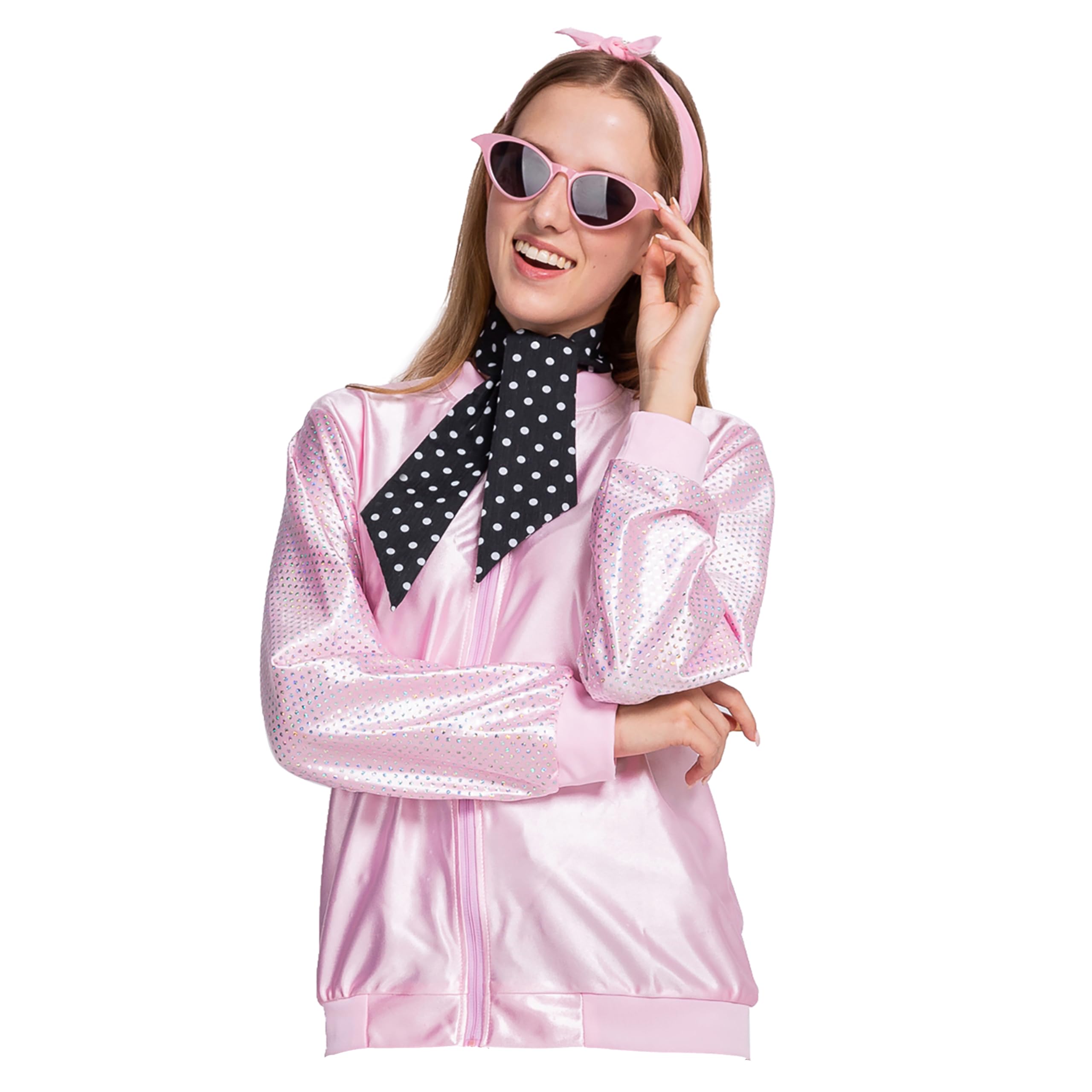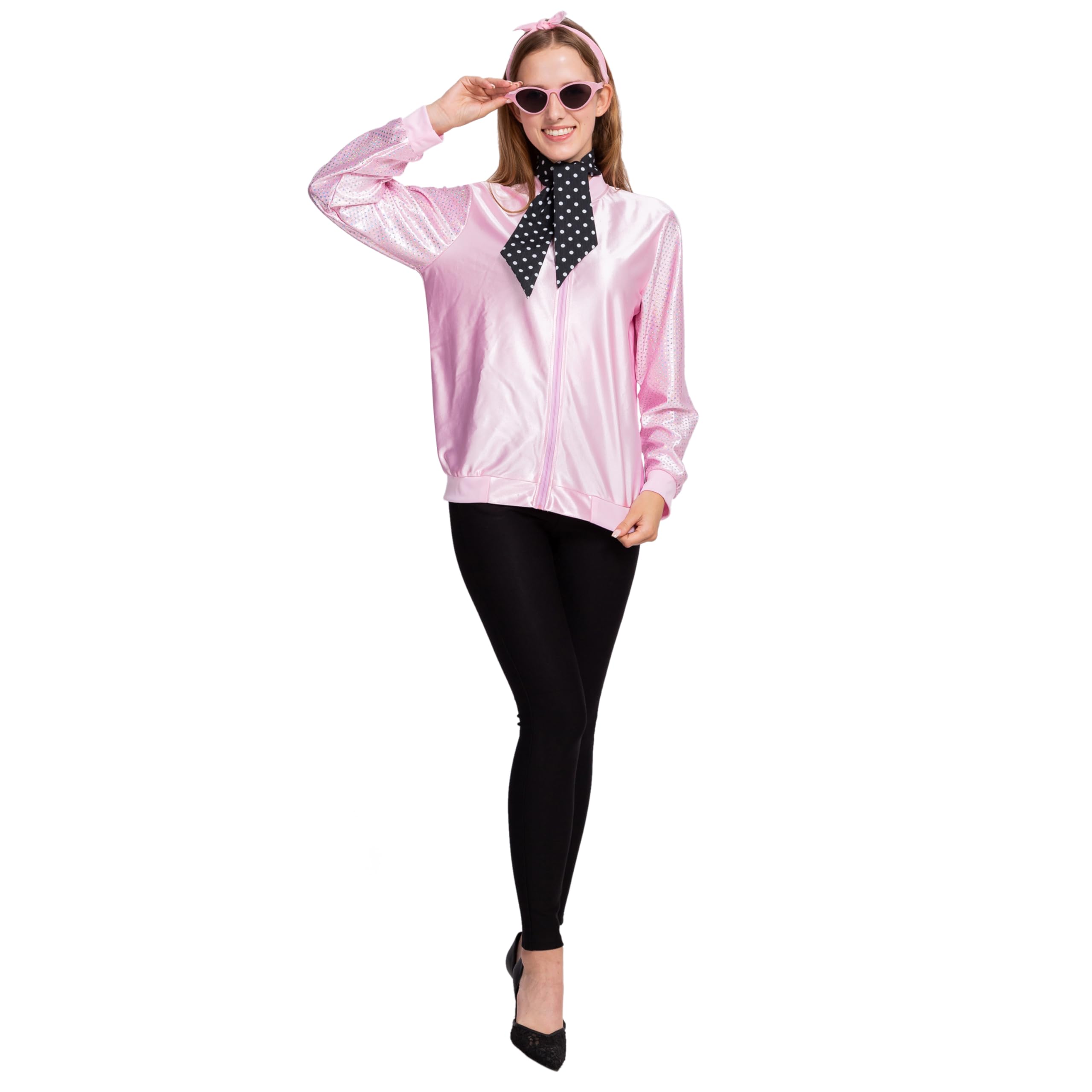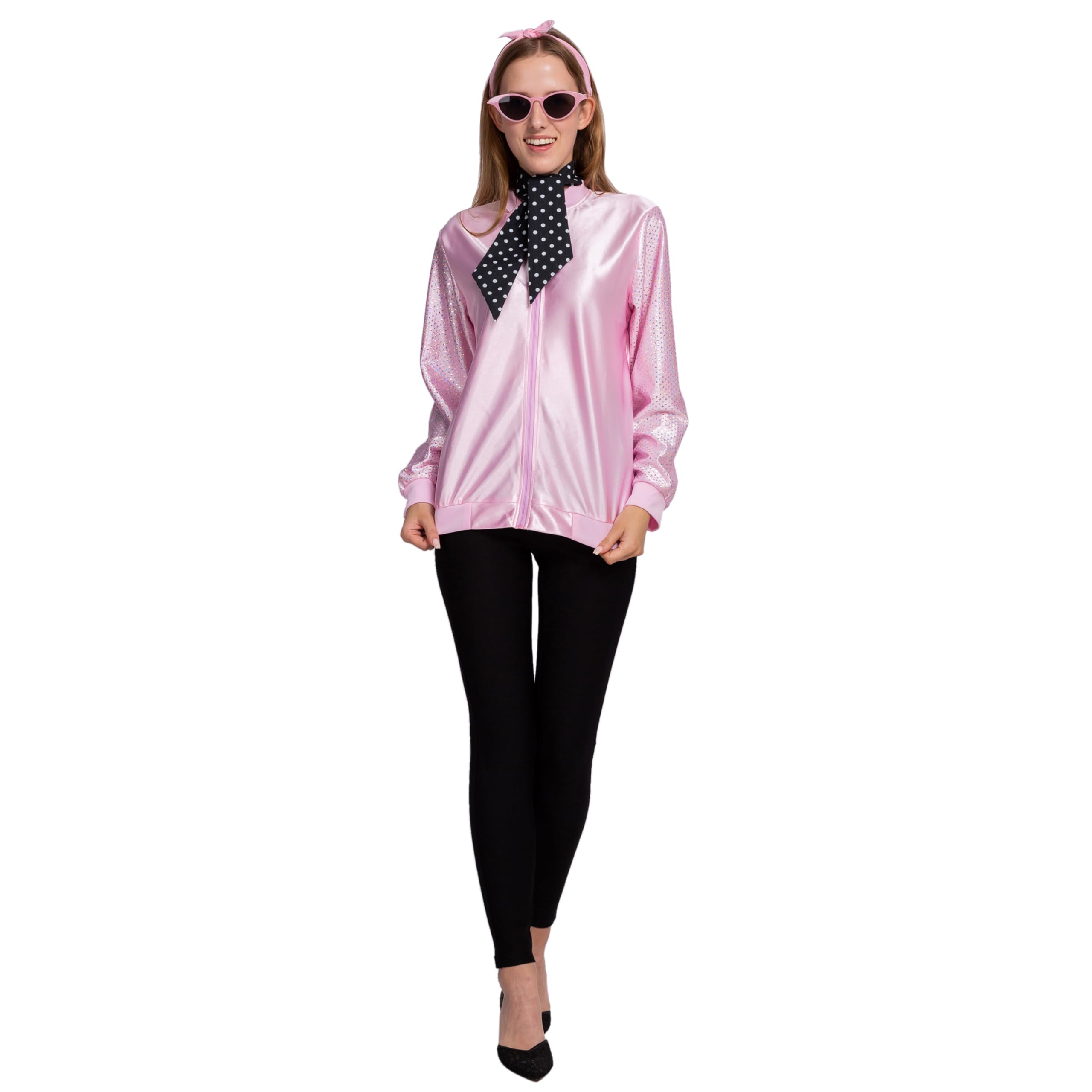 Sexy Pink Bomber Jacket Fifties Costumes For Women Includes Pink Satin Jacket, Polka Dot Scarf, Pink Scarf, and Cateye Reading Glasses.