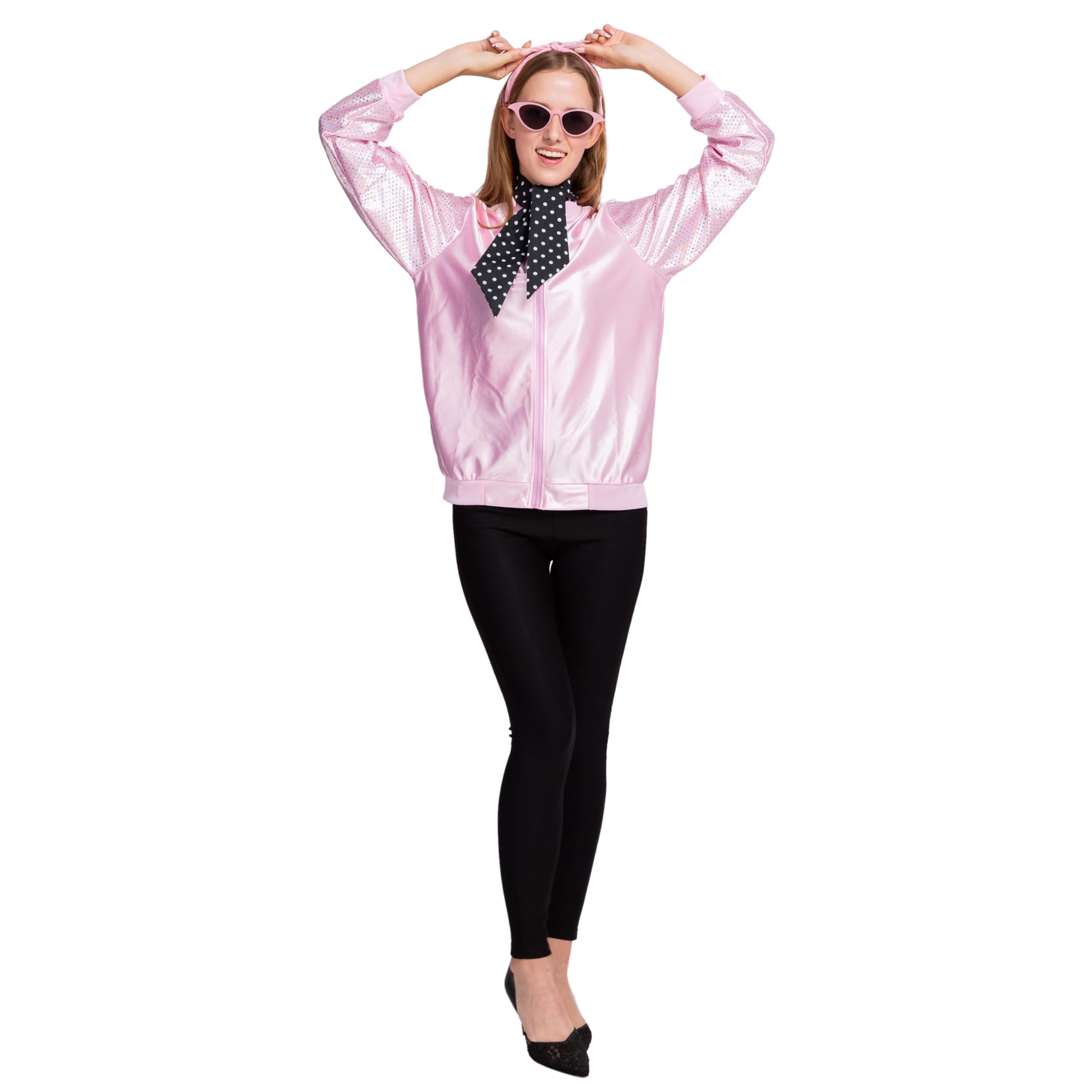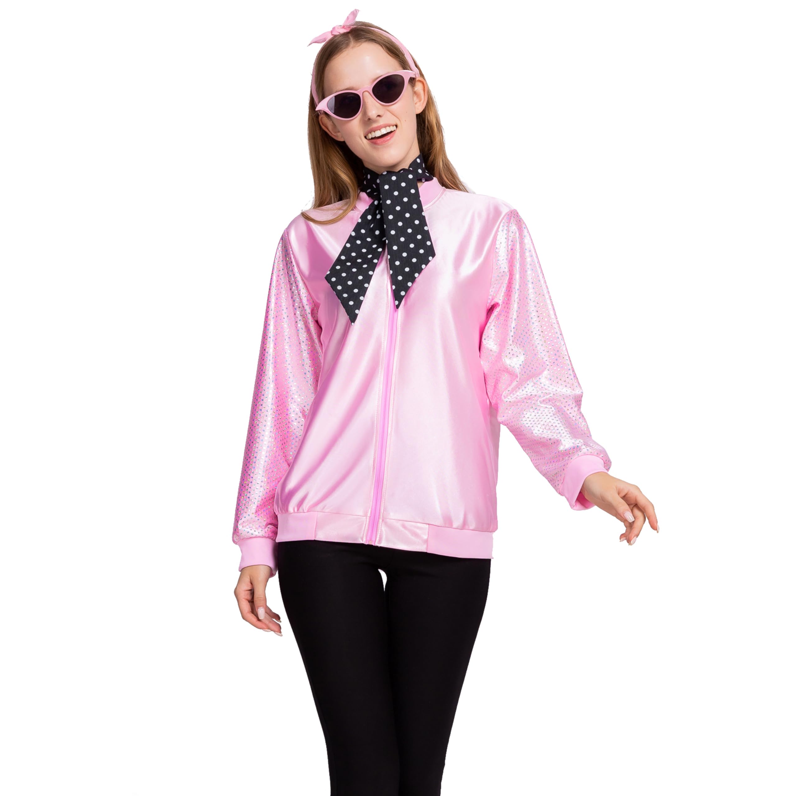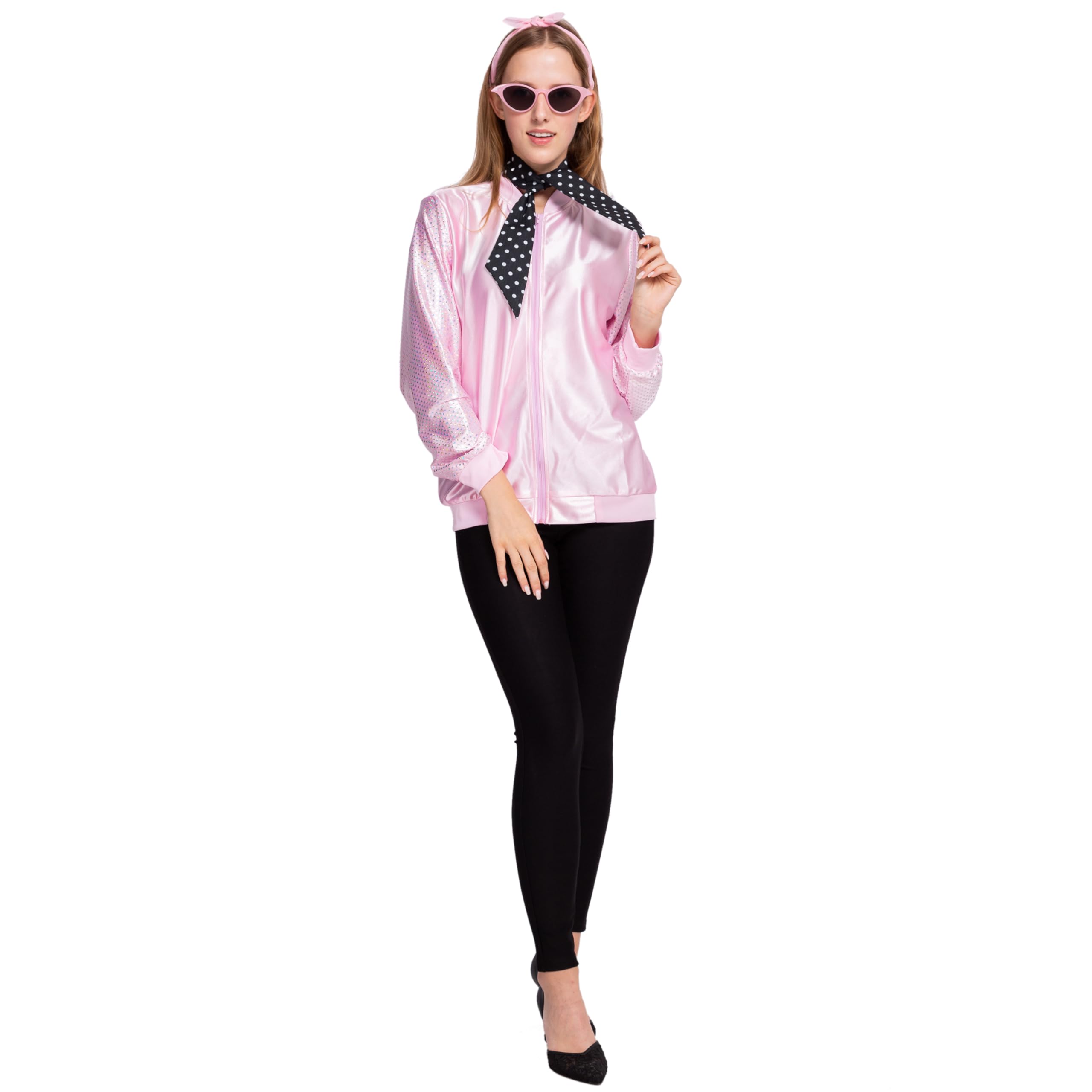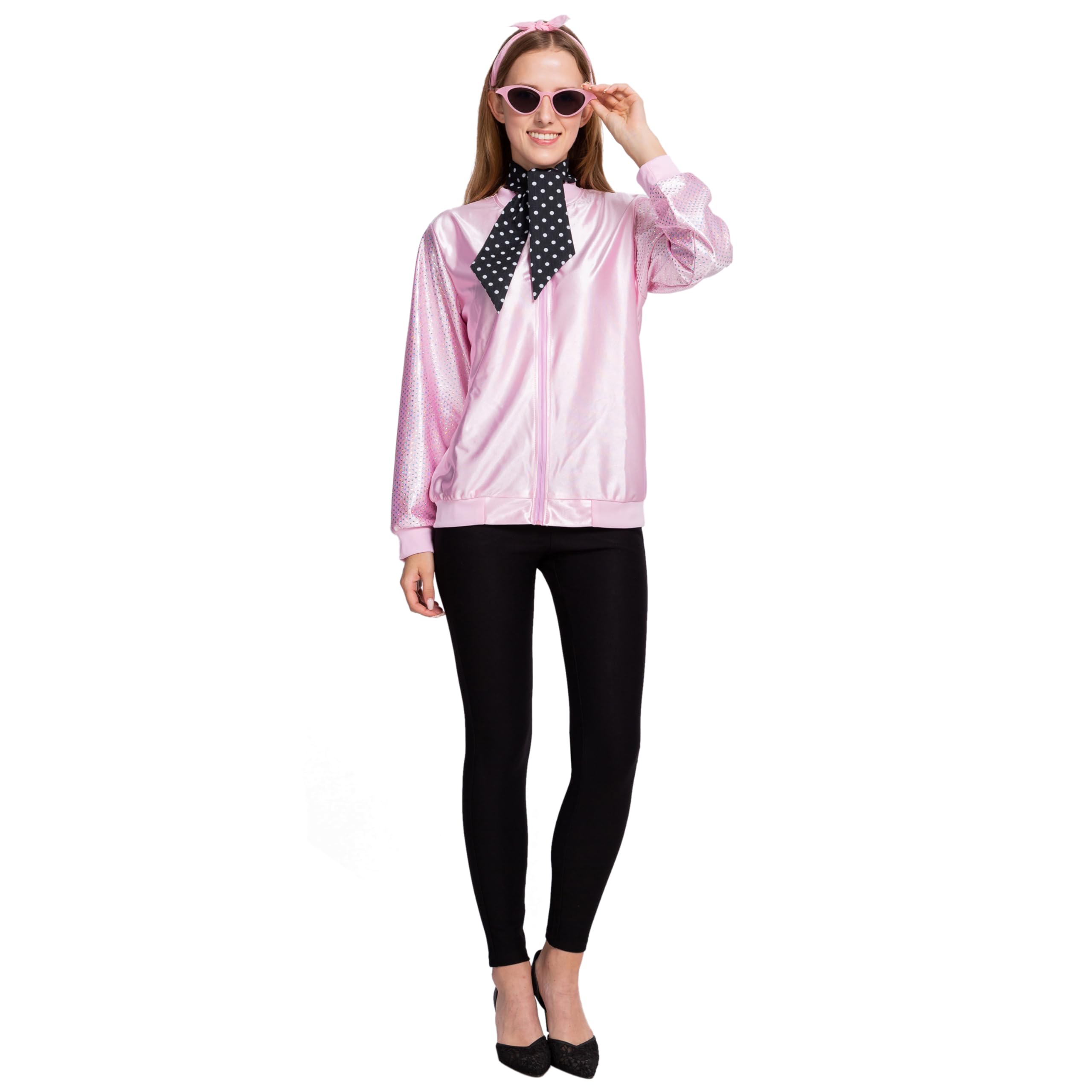 Sexy Pink Bomber Jacket Fifties Costumes For Women Includes Pink Satin Jacket, Polka Dot Scarf, Pink Scarf, and Cateye Reading Glasses.