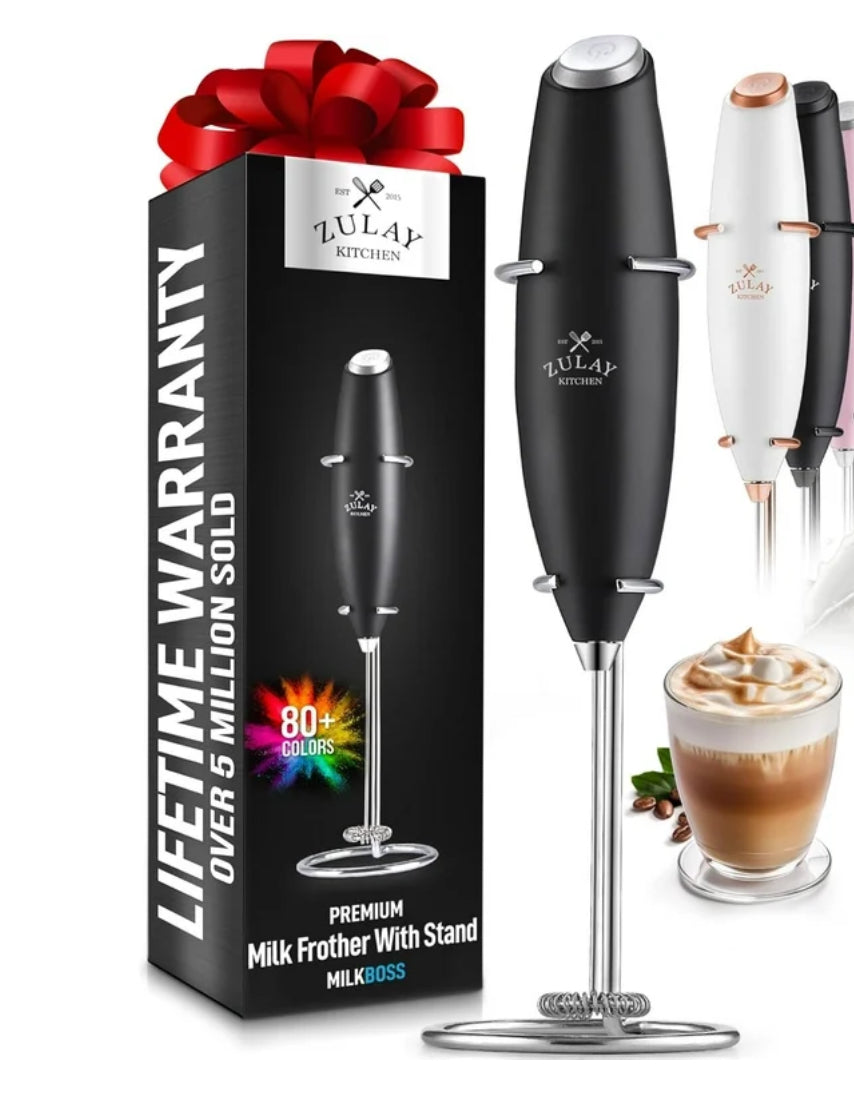 - Elevate your coffee experience with the Zulay Kitchen Milk Frother with Stand, a versatile handheld electric whisk that effortlessly creates rich, creamy foam for lattes, cappuccinos, and more.